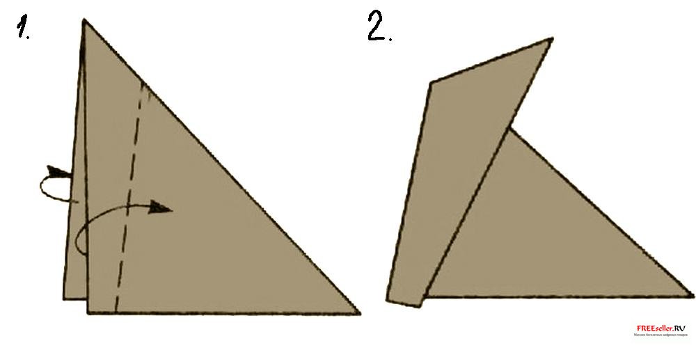 1) Если Вы видите этот знак на схеме какой-нибудь фигуры оригами, то он говорит о том, что нужно выгнуть лист, т.е. вывернуть часть изделия изнаночной стороной наружу. Предварительно нужно сделать перегиб, затем приоткрыть изделие и согнуть указанные части, вытягивая их наружу.