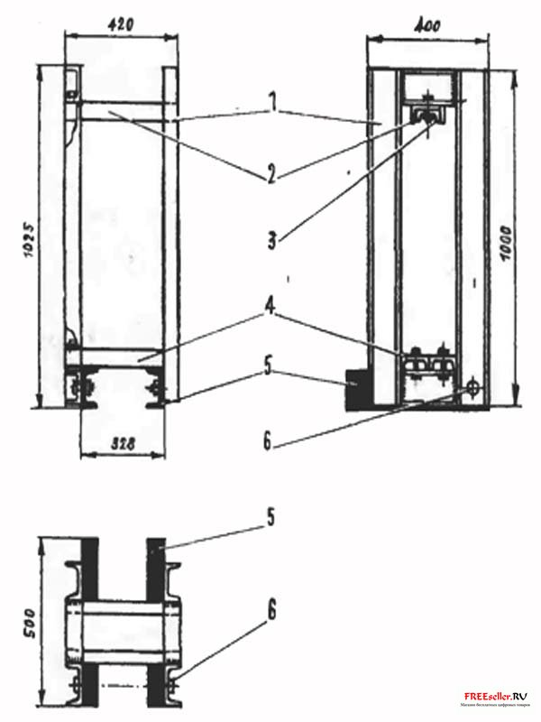 1 - боковины (швеллер 100), 2 -упорная балка (швеллер 100), 3 - усиление балки (швеллер 80), 4 - опорная пара балок (швеллеры 100), 5 - основание (швеллеры 100), 6 - шарнир (болт M10).