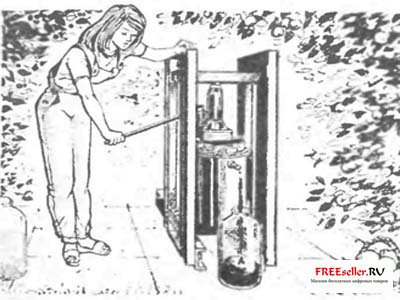 Основная часть пресса вертикальная прямоугольная рама. В нее помещается бак, а на него, на диск-крышку, устанавливается обычный автомобильный домкрат. С помощью такой соковыжималки можно всего за час переработать мешок яблок, получив сок хорошего качества.