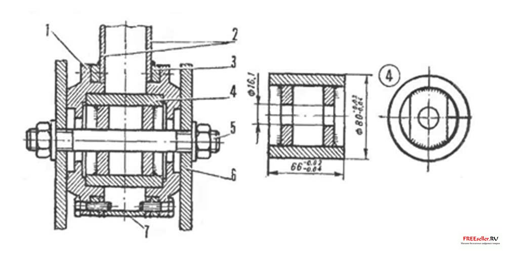 1 - корпус нижнего подшипника, 2 - щеки рамы, 3 - кольцо нижнего подшипникового узла, 4 - монтажная втулка (ложный корпус подшипника), 5- монтажная шпилька, 6 - пластина, 7 - опоясывающая полоса.