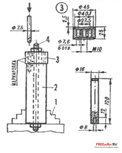 1 - зажим, 2 - дистанционная трубка, 3 - кондуктор, 4 - шпилька.