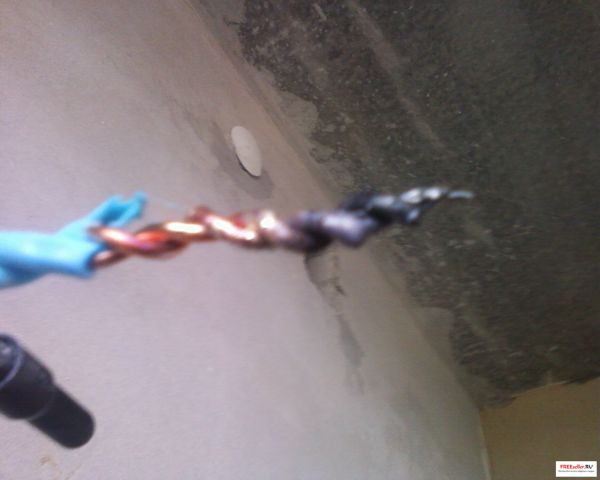 - действуя угольным электродом, подключенным к другому выводу трансформатора, расплавляем концы скрученных проводов, образуя при этом аккуратный шарик из расплавленной меди.<