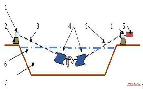 1. Подшипник, 2. Опора, 3. Металлический трос, 4. Гидроколесо (турбина), 5. Электрогенератор, 6. Уровень верхнего течения реки, 7. Русло реки.