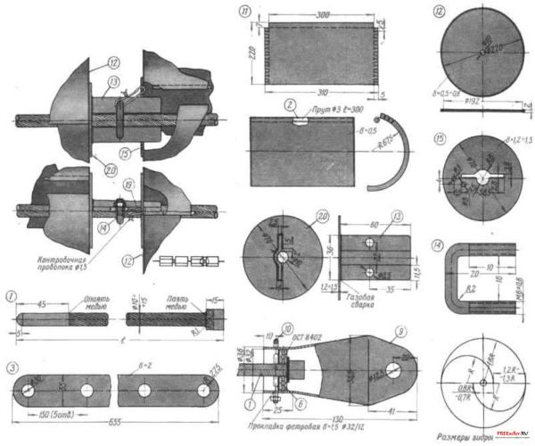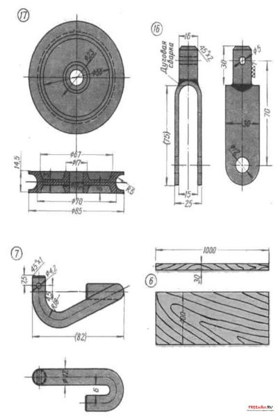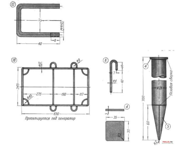 Конструкция отдельных узлов и деталей может быть без ущерба изменена. Рама (деталь 18) для генератора, например, может быть выполнена из деревянных брусьев, конфигурацию детали 17 можно упростить, выполнив шкив из трёх дисков, склёпанных вместе, и т.д.