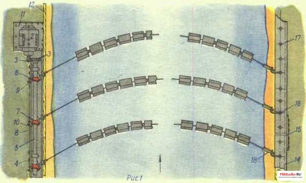Реакция сил натяжения троса воспринимается береговыми опорами, которые состоят из подпорных досок 6, укреплённых в грунте, и опорных лент 3, имеющих отверстия, через которые забиваются в грунт клинья 4,5, удерживающие опоры. На раме 18 установлены редукторная и генераторная части установки. Свободная опора на противоположном берегу имеет крюк 7 и узел опорного подшипника 6, 9, 10, обеспечивающего свободное вращение троса под разными углами к направлению потока воды. Крепление второго конца троса также шарнирное.