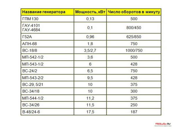 В таблице приведены названия и основные данные наиболее распространённых генераторов, которые могут быть использованы на микрогэс.