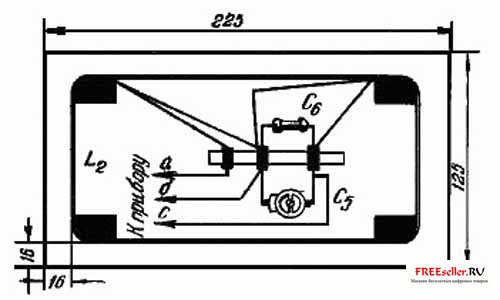 Катушка L2, входящая в выносную головку металлоискателя, намотана а виде рамки проводом ПЭЛ 0,5. Она имеет 50 витков, с отводом от 10 витка, считая от конца, подсоединяемого к конденсатору С7. Её витки расположены на четырёх стойках, укреплённых на пластине из изоляционного материала, как его показано на рис. 2. Кроме катушки, здесь расположены конденсатор С6 и подстроечный конденсатор С5. Соединение выносной головки с прибором производится трёхжильным кабелем длиной около 1,5 м.