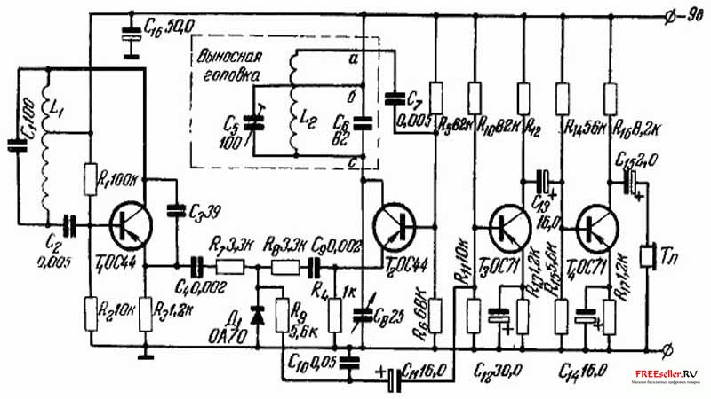 Выходные напряжения генераторов снимаются с эмиттеров транзисторов и через цепочки С4R7 и R8C9 подаются на диодный детектор Д1. Биения, образующиеся на выходе детектора, отфильтровываются цепочкой R9C10 и поступают на вход двухкаскадного усилителя звуковой частоты на транзисторах Т3 и Т4. На выходе усилителя включён пьезоэлектрический головной телефон Тлф.