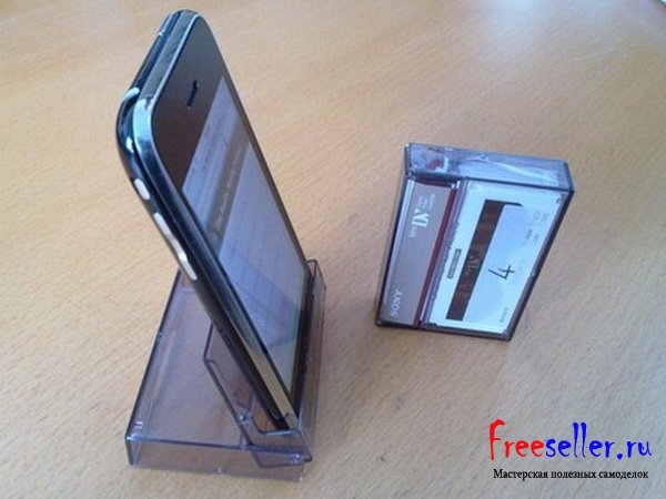 1) Подставка для телефона из пластиковой коробки кассеты от видеокамеры.