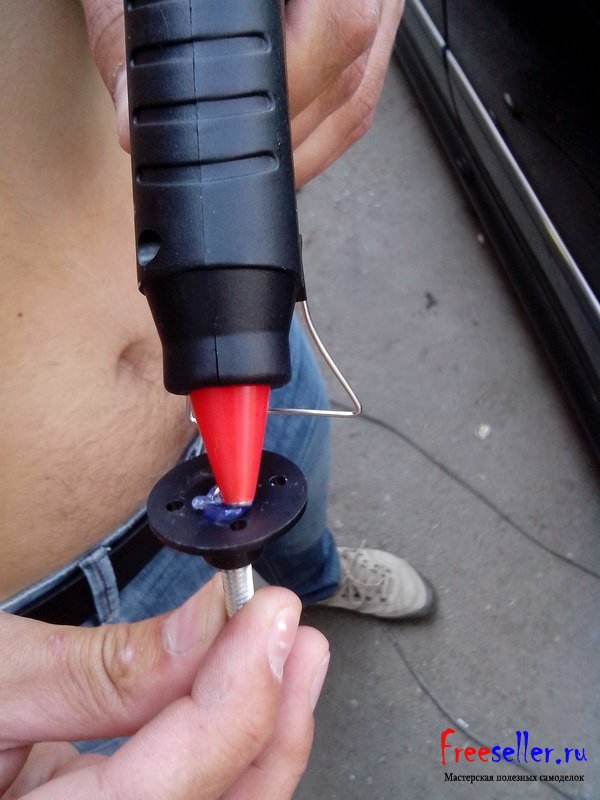 Подбираем присоску нужного диаметра, разогреваем клеевой пистолет, и наносим немного клея на присоску.