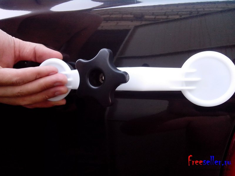 Потихонечку, не резко. закручиваем гайку в пластиковом барашке. Накручиваем гайку до тех пор, пока присоска не отстрельнет. (Если закрутили барашек до упора, но присоска не отстрельнула, значит присоска была приклеена на вмятину не в нужном месте.