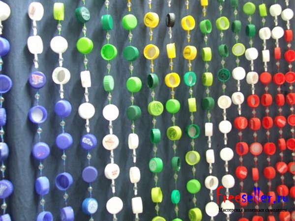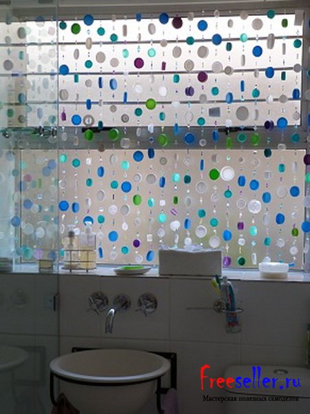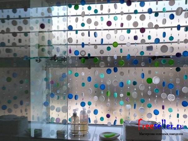 Самодельные шторы из пластиковых крышек прекрасно впишутся в интерьер в ванной комнате, конечно если ванная комната у вас с окном, или в детской комнате поверх обычных штор.
