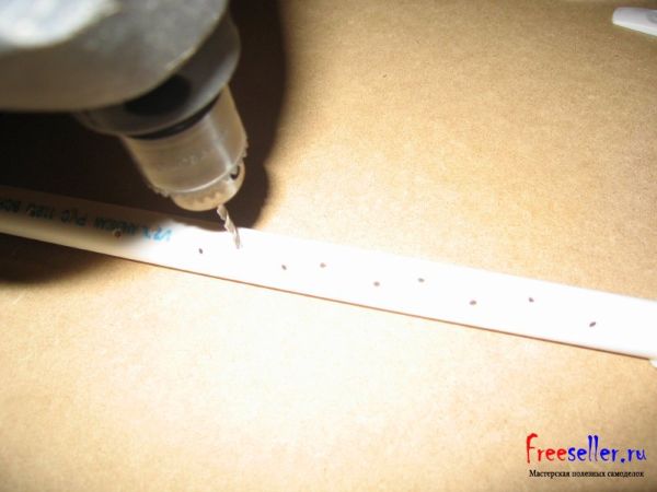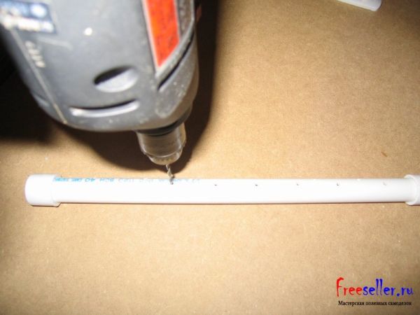 Просверлите отверстия в пластиковой трубе сверлом 3-4 мм по одной линии трубы с шагом 2 см.