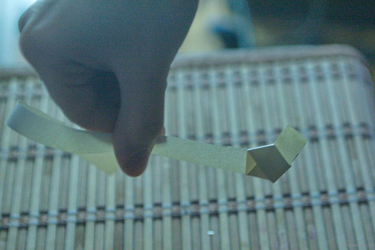 10) Самый важный момент: двумя пальцами одной руки держим наш пятиугольник, а ногтем другой руки надавливаем на одну грань пятиугольника, стараясь попасть в серединку грани. То же самое проделываем и с остальными гранями.