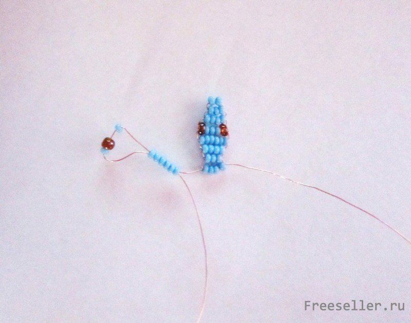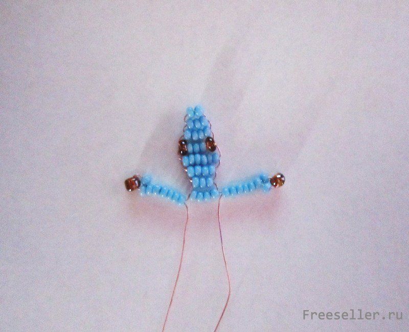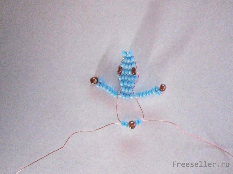 Туловище. 1 ряд-4 бусины. Здесь делаем передние лапки на левую часть проволоки нанизать 7 бусин голуб. цвета-1корич.-1 голуб. Затем еще раз протянуть проволоку исключая первые 3 бусины.
