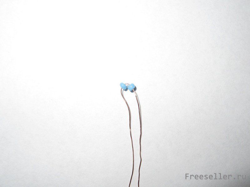 Плетение начинаем с головы. Нанизать на проволоку две бусины, перегнуть проволоку бусины по середине.