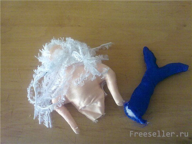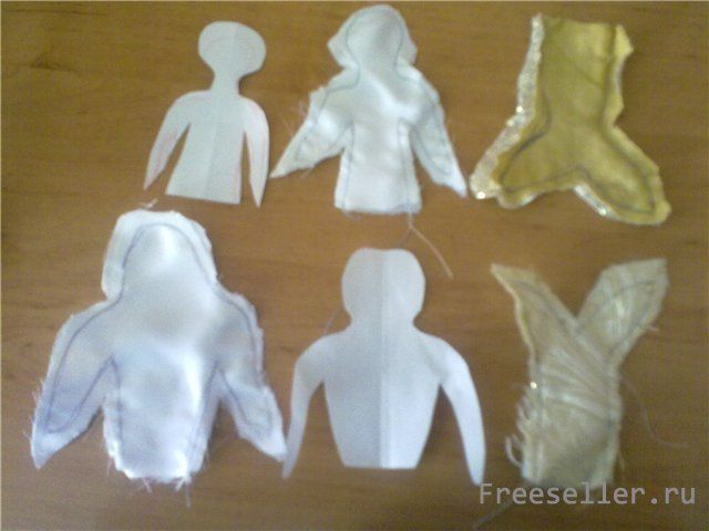 1. Делаем выкройку из бумаги: туловище русалки, Нептуна и хвосты. Прикладываем ткани и вырезаем. Сметываем по намеченным линиям и прострачиваем на машинке.