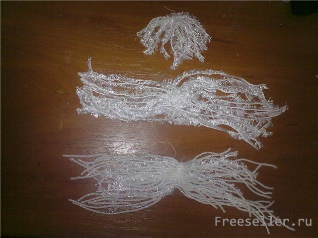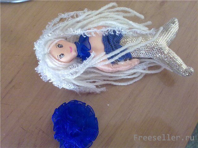3. Нептуну пришиваем пояс, под которым прячем линию соединения деталей. Делаем волосы и бороду из ниток.