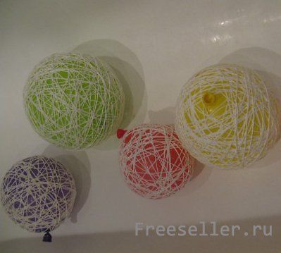 Далее постепенно протаскиваем нитки сквозь проделанные отверстия в клее, аккуратно наматывая их на шар. После того, как шар будет полностью обмотан, нить можно отрезать и аккуратно спрятать.