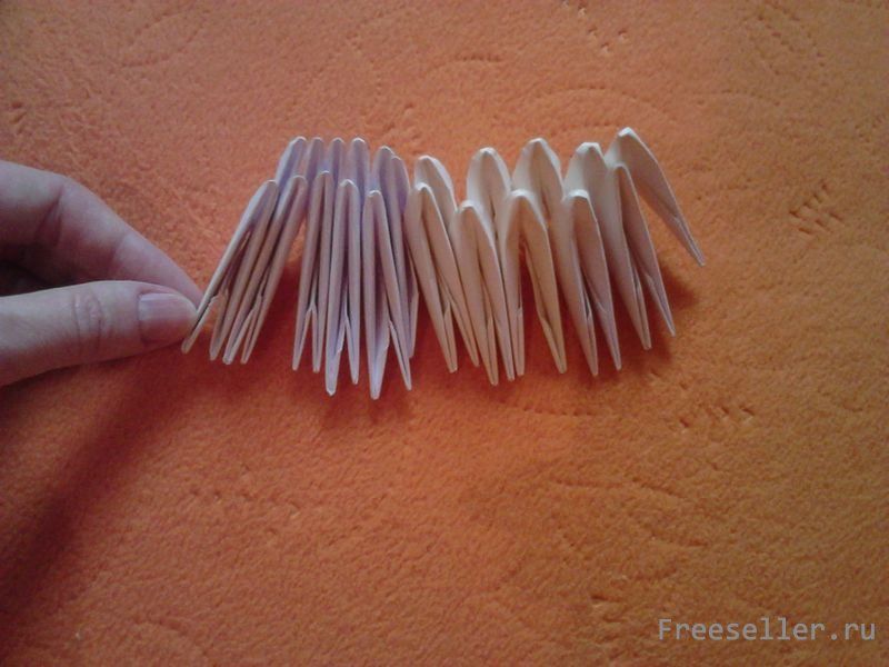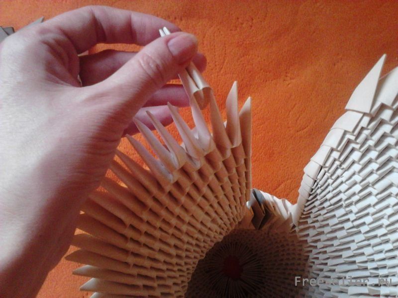 Одеваем заготовки по кругу и, начиная с 7-го ряда, формируем крылья, убавляя по одной заготовке с каждым рядом. Под хвост и шею оставляем по 3 модуля.