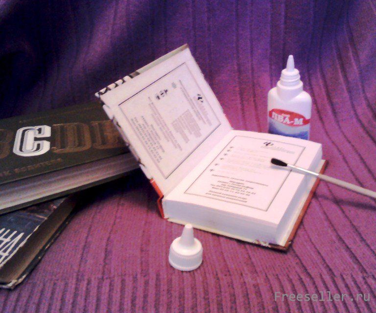 Затем надо проклеить клеем ПВА страницы, можно кисть, можно развести клей в небольшой чашке и пропитать книги. Я воспользовался кисточкой. Не все конечно странички мазать надо клеем, Главное тут скрепить основные - потом под гнетом все пропитается клеем ПВА, а еще всю конструкцию потом зажмем креплением для провода. Так что можете не переживать!