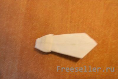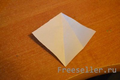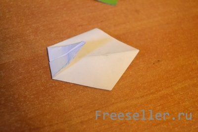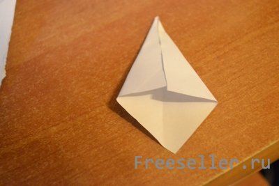 Складываем его по диагонали, угли к середине, далее загибаем на обратную сторону кончик, и подгибаем его по середине.