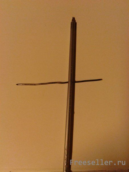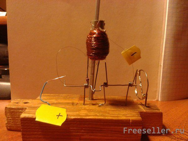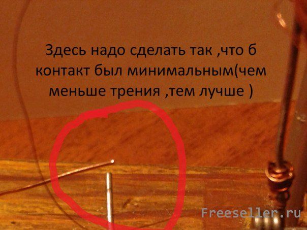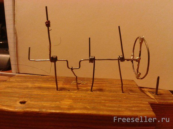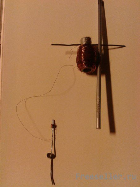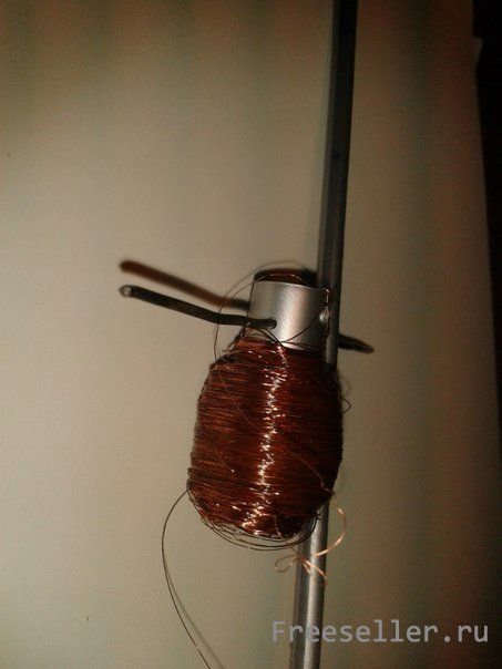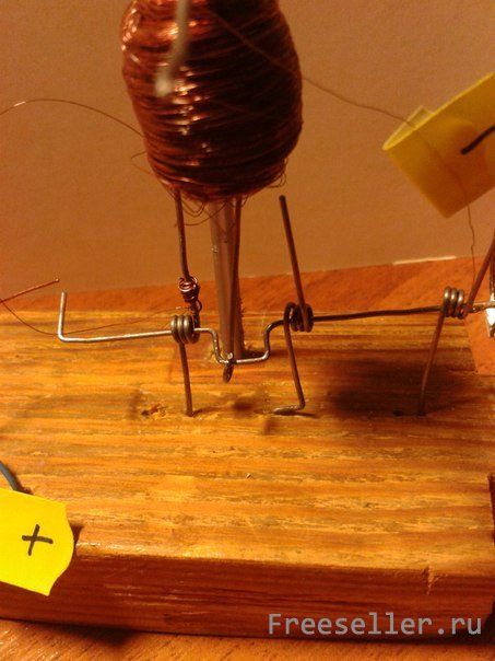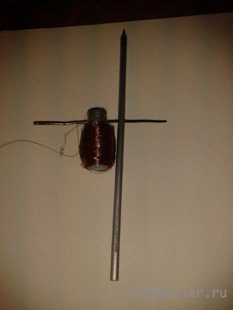 намарайте катушку, соедините ее с держателям (в моем случае это обычный стержень от ручки ;сделайте шилом дырки в бруске (желательно одной глубины);
