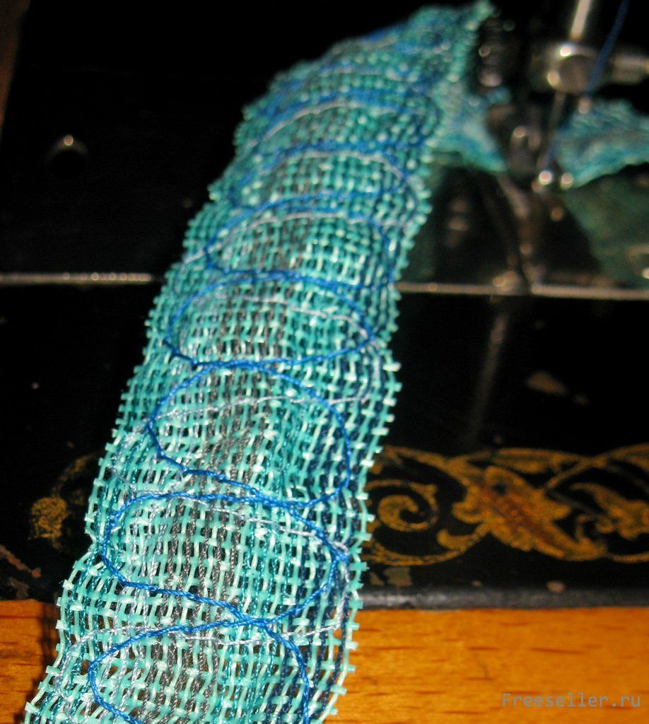 2) прострачиваем на швейной машинке ряды из ниток разных цветов, а затем фигуры (зигзаги, волны, кольца, треугольники и т.д. - все, что угодно) - сетка - удобный материал для растрочки без разметки;