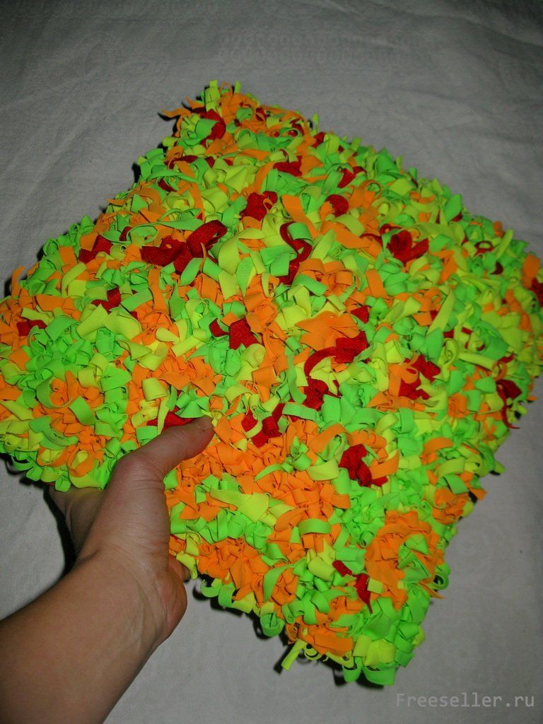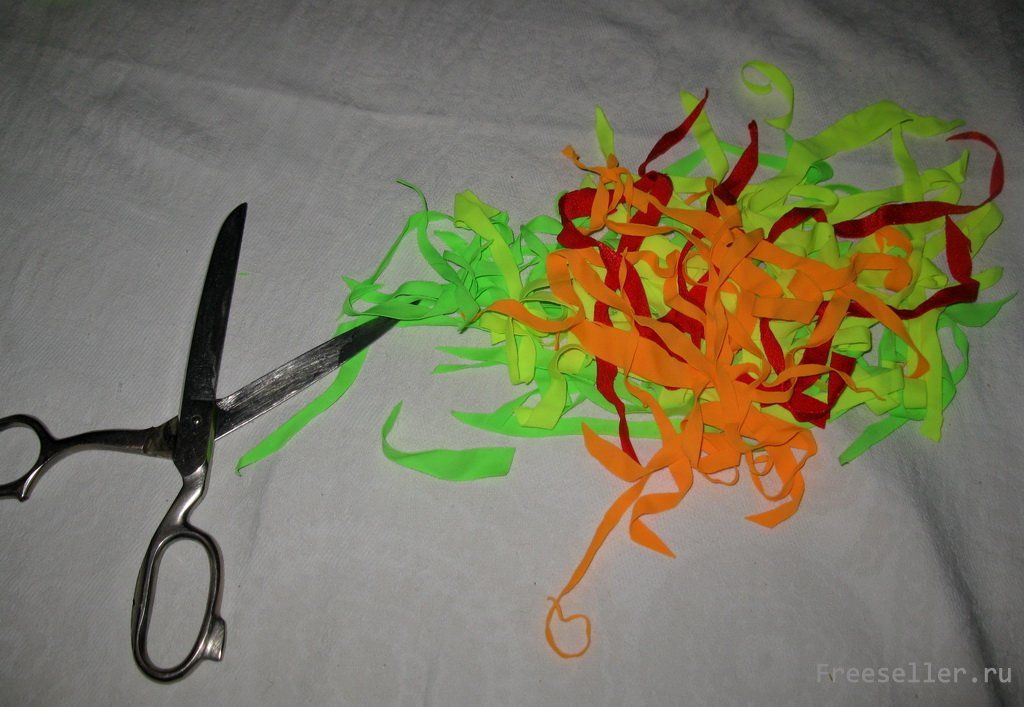 1) нарезаем полоски ткани разных ярких оттенков (ширина - 0,6-1 см, длина может быть разная );