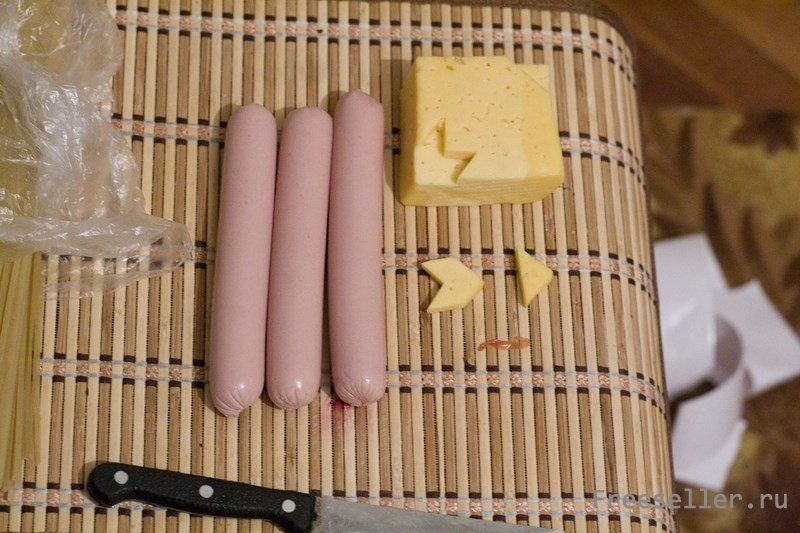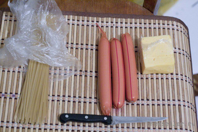 Режем сосиску на две части, скрепляем макарониной и сыром: