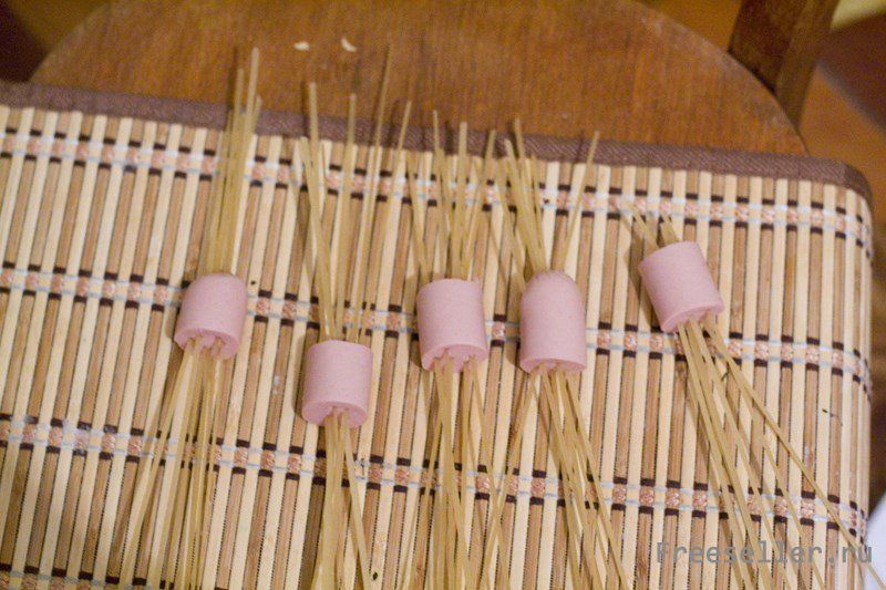 Вторую сосиску режем на кусочки, вставляем в нее макаронины. Варим.