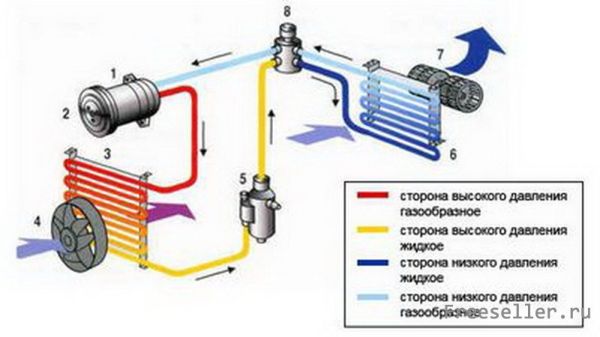 Сначала он поступает в конденсатор, в котором охлаждается и превращается в сжиженый газ (охлаждение происходит за счет вентилятора автокондиционера).