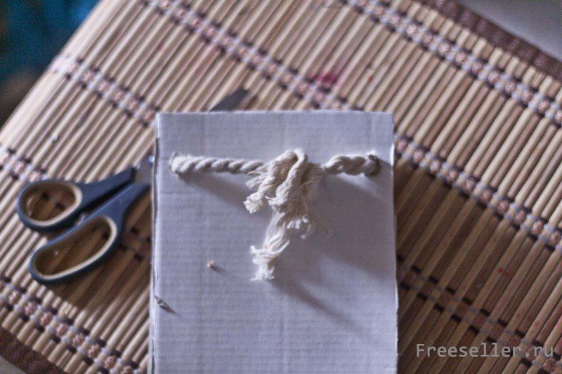 4) Засовываем верёвку в кассовую ленту и продеваем её в дырочки. Завязываем.