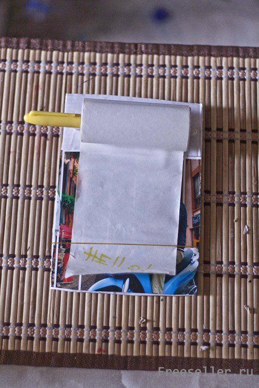 5) Вставляем возле верёвки фломастер или ручку, чтобы писать удобнее было. Внизу продеваем резинку для закрепления полосок бумаги. Ну вот и все- наш с Вами отрывной блокнот готов.!