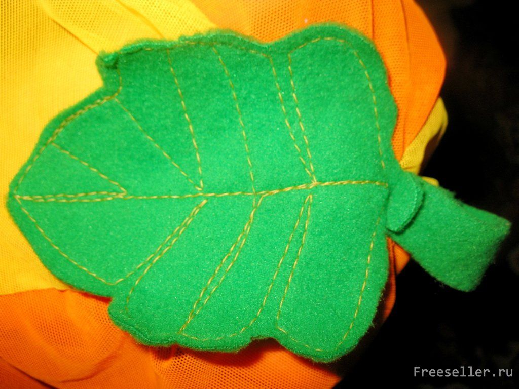 5) В центр "тыковки" пришиваем листик, делая петлю из стебля; на самом листке можно дополнительно строчкой сделать прожилки (для красоты);