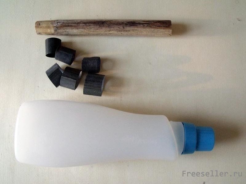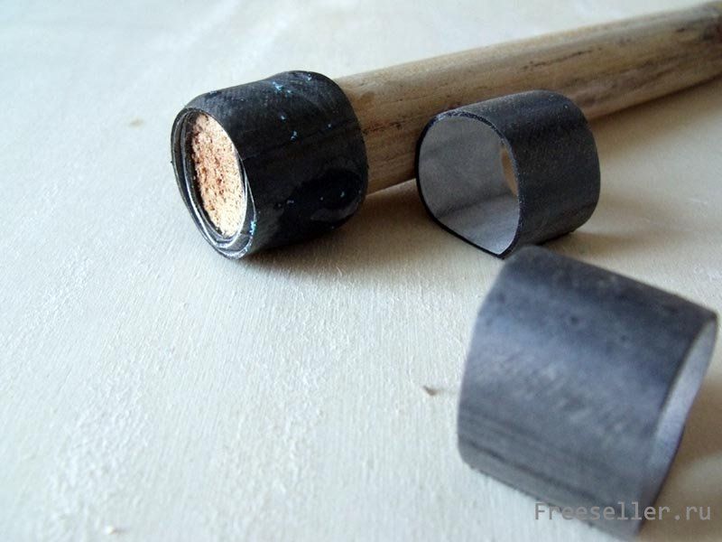 5) Возьмите внутреннюю часть велосипедной шины и вырежьте из неё где-то 6 колец. Теперь поместите их на деревянную палку от швабры (или другого инструмента), надевая их, друг на друга. Кстати, будет лучше, если предварительно вы отшлифуете эту палку, чтобы она приобрела лучший вид. Как только всё готово и кольца одеты друг на друга, проверь, сможете ли вы поверх них надеть ещё и крышку. Учтите, что надевать её нужно тем концом, от которого был отрезан верх. Если же крышка продевается не достаточно туго, то отрежьте ещё несколько колец и наденьте их поверх других. Если же наоборот - то снимите парочку.