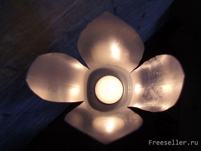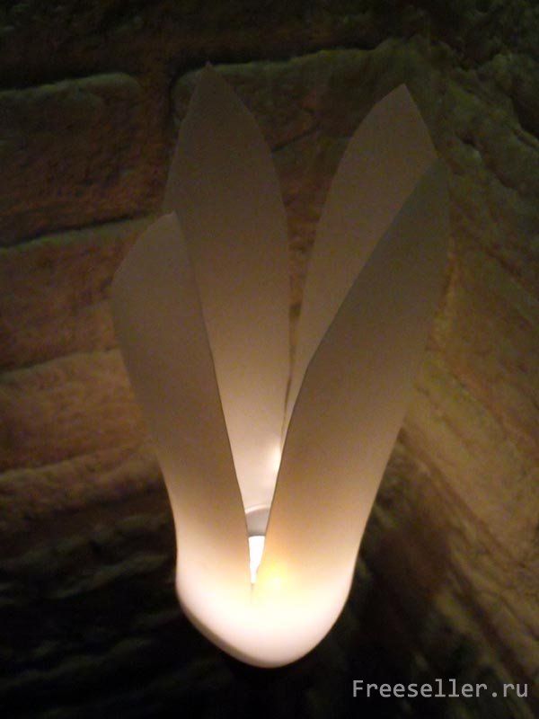 Теперь осталось только обратно прикрутить бутылку и поставить самодельный светильник в саду. После можно будет в него вставить плоскую свечку на дозатор и осторожно зажечь её.