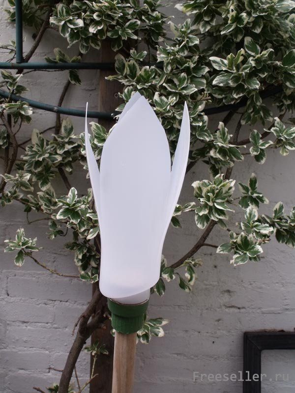 Если вы не знаете, как украсить свой сад, то эта самоделка будет для вас. Только из одной бутылки матового белого цвета можно создать красивый светильник, который не только идеально впишется в любой дизайн, но ещё и будет приносить незаменимую пользу. Этот светильник – невероятно элегантный, да ещё и недорогой. Разместить можно в любом месте, электричество не нужно, только парафиновая свечка. Но и это не последний его плюс. После того, как вы соберёте все необходимые материалы, вам понадобится всего 10-15 минут, чтобы изготовить его. Кроме того, это хороший способ переработки использованного материала.