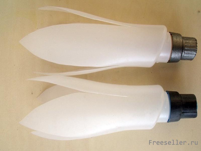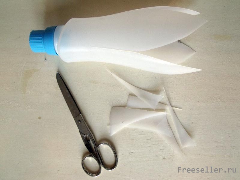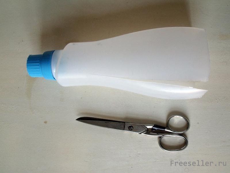 2) Теперь пришло время воспользоваться ножницами. Сделайте четыре длинных разреза по углам бутылки. Помните о том, что разрезы не должны доходить до самого горла бутылки. Оставляйте, хотя бы пять-шесть сантиметров до горлышка.