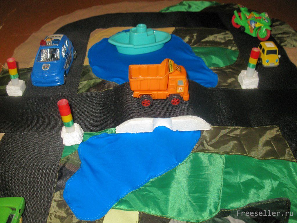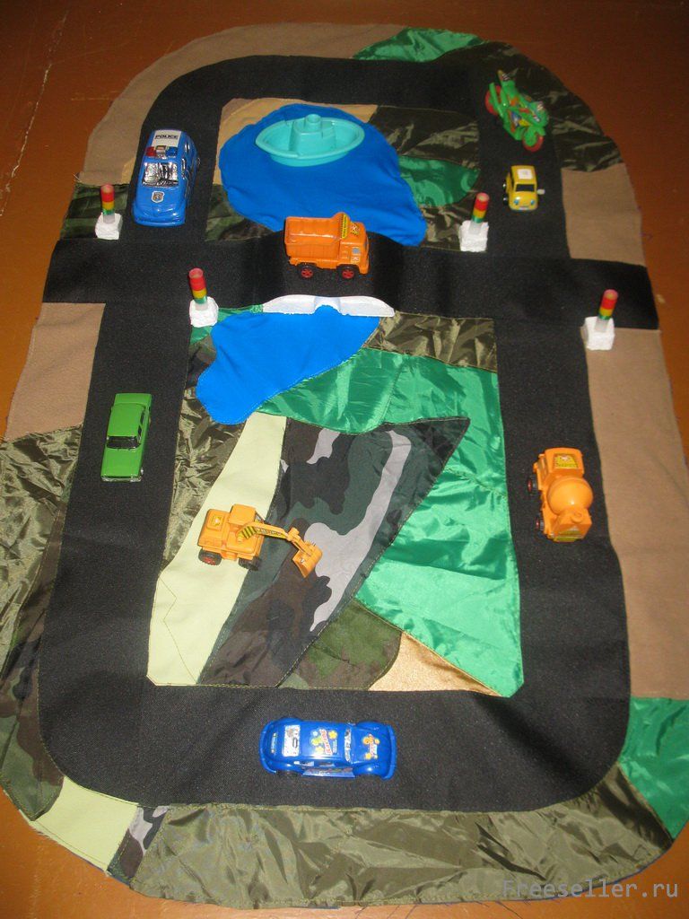 Отличный самодельный коврик с автодорогой, природным ландшафтом и мостиком для развлечения малыша.