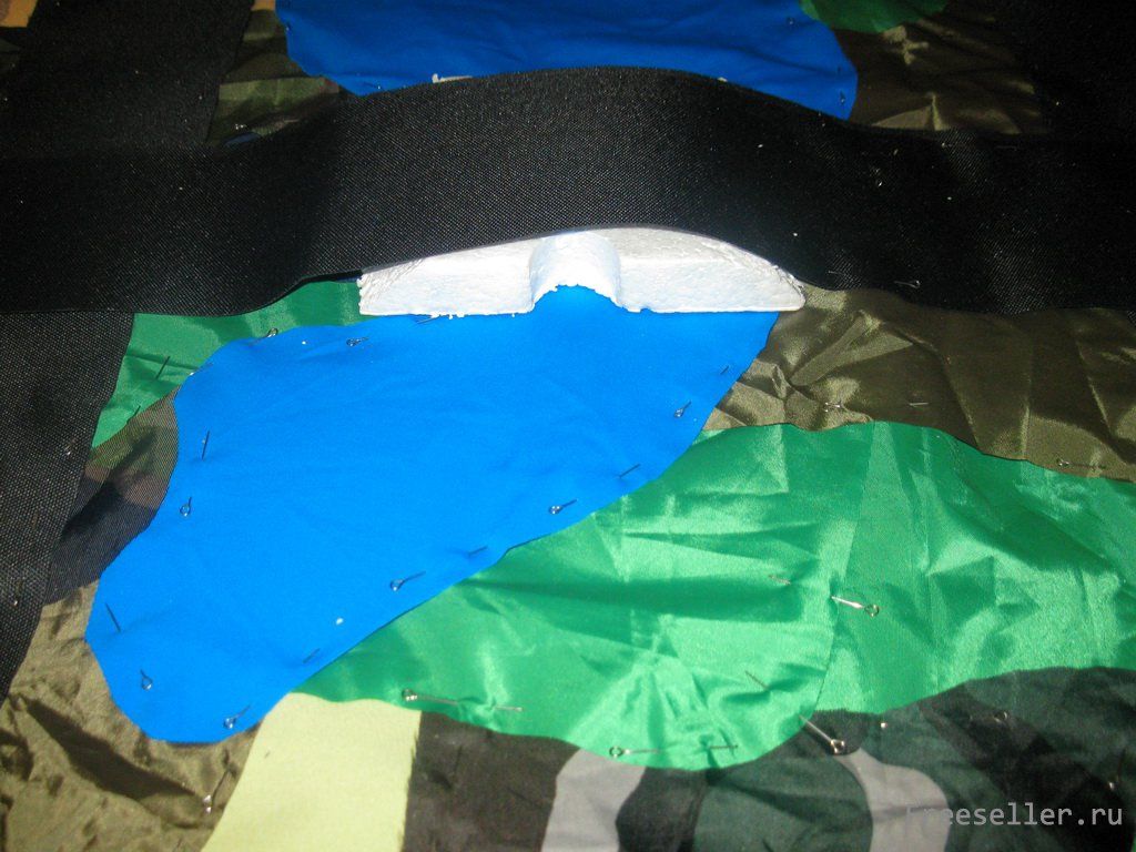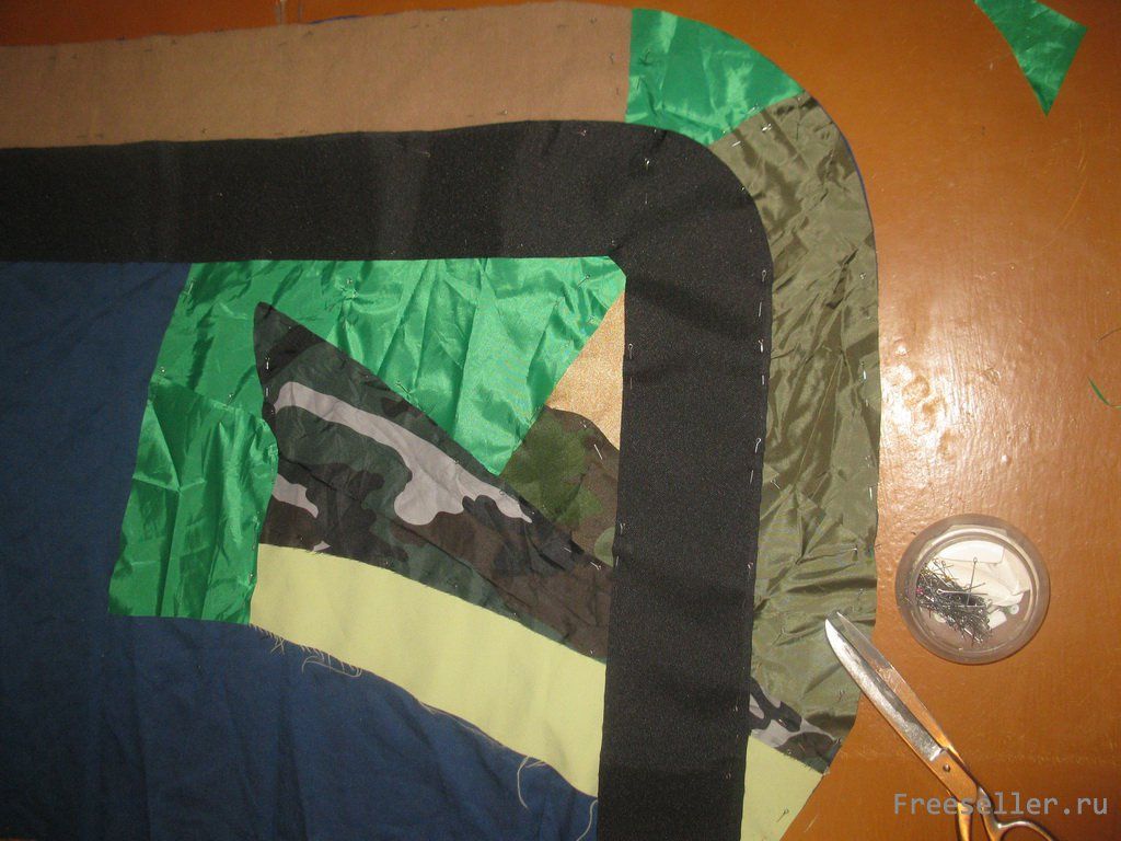 2) прикалываем на основу корсажную ленту - дорогу, формируя закругленные углы, и вырезанные кусочки ткани, имитирующие зеленые насаждения вдоль дороги, песчаный пляж, лесной массив, озера или речку;