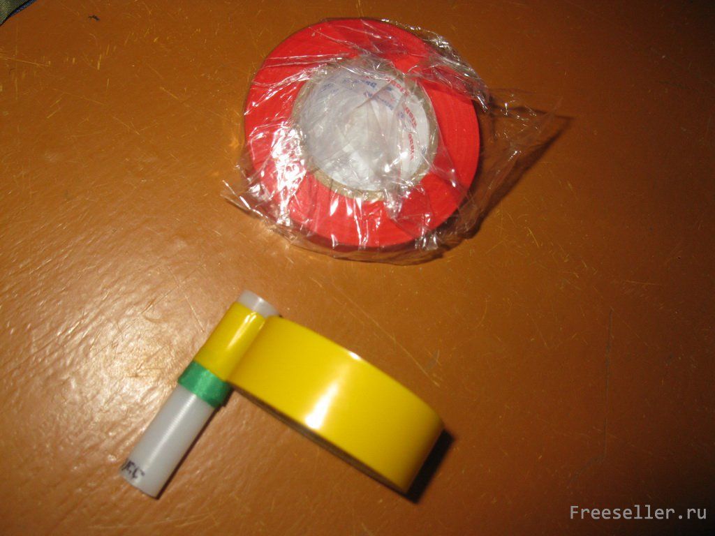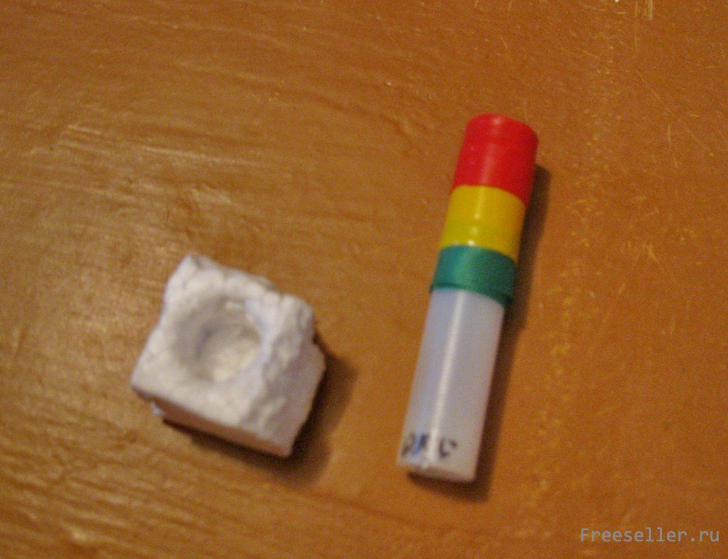 4) делаем светофоры: обматываем изолентой пустую катушку в следующей последовательности: зеленый, затем с набегом на край желтый, а затем красный, срезаем излишки сверху, прорезаем ножом отверстие в пенопласте и вставляем светофор;