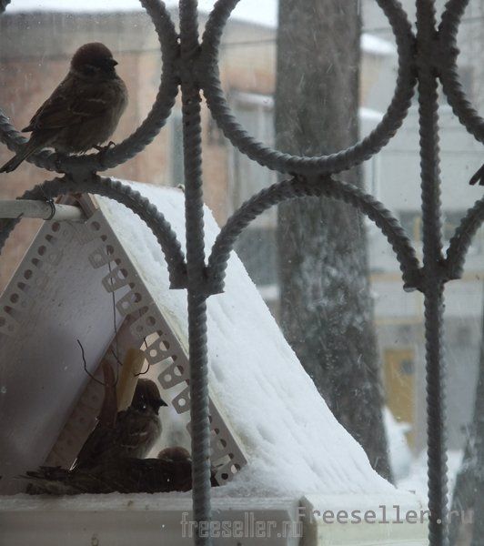 Если утром в кормушке пусто - "братва" на оконной решетке располагается головой к нам, ну а если еда была и ее хватило, то, соответственно .... Так вот и соседствуем.