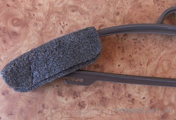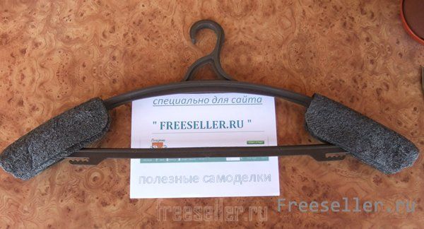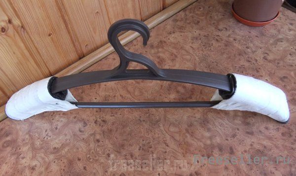 Вешалки, продаваемые в торговле, не всегда подходят для кожаной одежды. Особенно для мужской, так как узки в плечах. А если на такой вешалке повесить еще и сырую кожаную одежду, то после высыхания на плечах образуются подобия рогов, выступов, которые очень трудно удаляются, так как кожа вытянулась. :am: Предупредить такие казусы не сложно. Нужно "доработать" вешалку. Для чего берем толстый поролон и из него вырезаем два куска. Приклеиваем их клеем "Момент" на обе оконечности плечиков с таким расчетом, чтобы размах в плечах получился под Вашу одежду и ее плечи полностью ложились на этот поролон.
