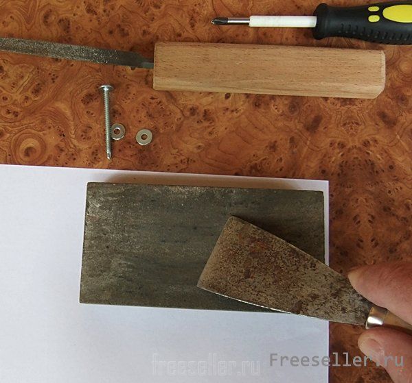 Шпатель нужно заточить напильником и поправить окончательно на бруске. Тогда он будет без труда подсекать корни сорняков.
