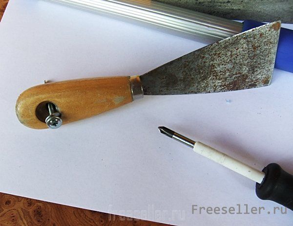 Для пожилых людей,которым сложно сильно нагибаться, работать тяжелыми инструментами, но желающими в силу жизненной привычки и необходимости "поковыряться" в земле - предлагаю сделать простую и легкую тяпочку для работы в легких сыпучих грунтах, прополки от сорняков. Для этого берем отслуживший свой срок шпатель, деревянную сухую или алюминиевую трубчатую ручку, шуруп с парой шайб.