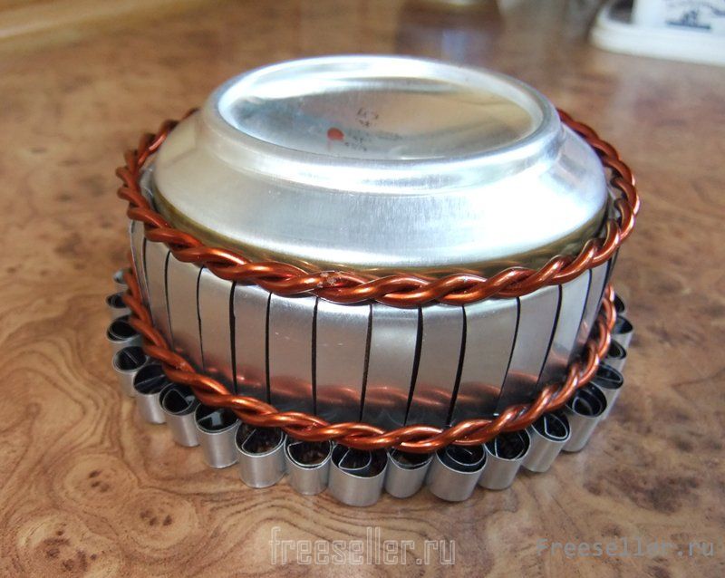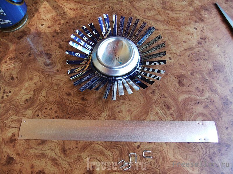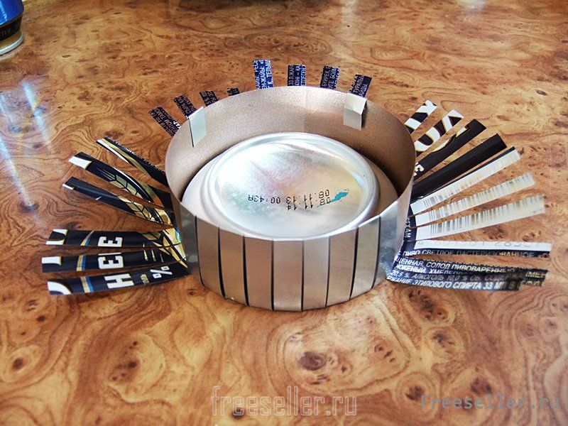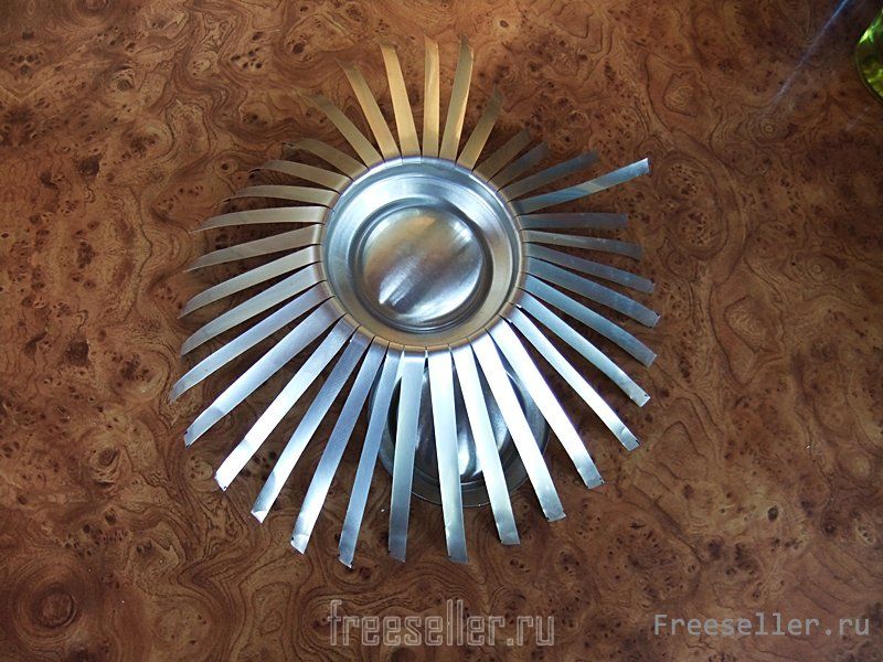 Отогнув их под углом 90 градусов банку переворачиваем кверху дном и придавливаем, чтобы выровнять торец. Из полоски жести вырезаем пластину. Длина ее должна быть чуть больше длины периметра баночки.
