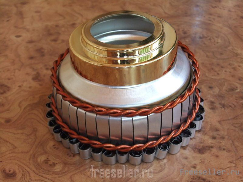 Двойное дно с воздушной прослойкой предотвратит быстрое испарение ароматической жидкости. Продолжаем совершенствовать испаритель. Из обрезков полосок делаем спирали и украшаем ими стенку испарителя.