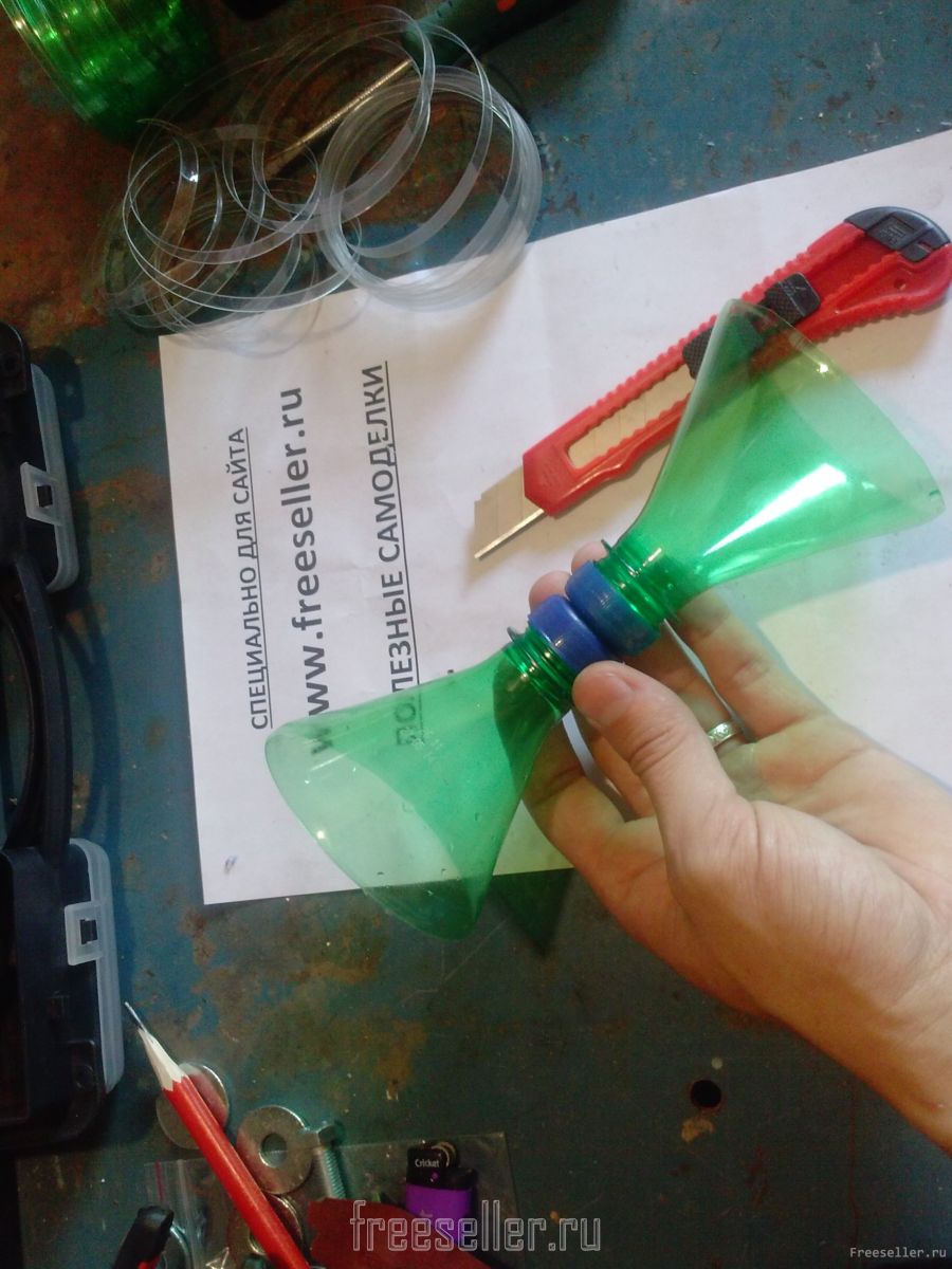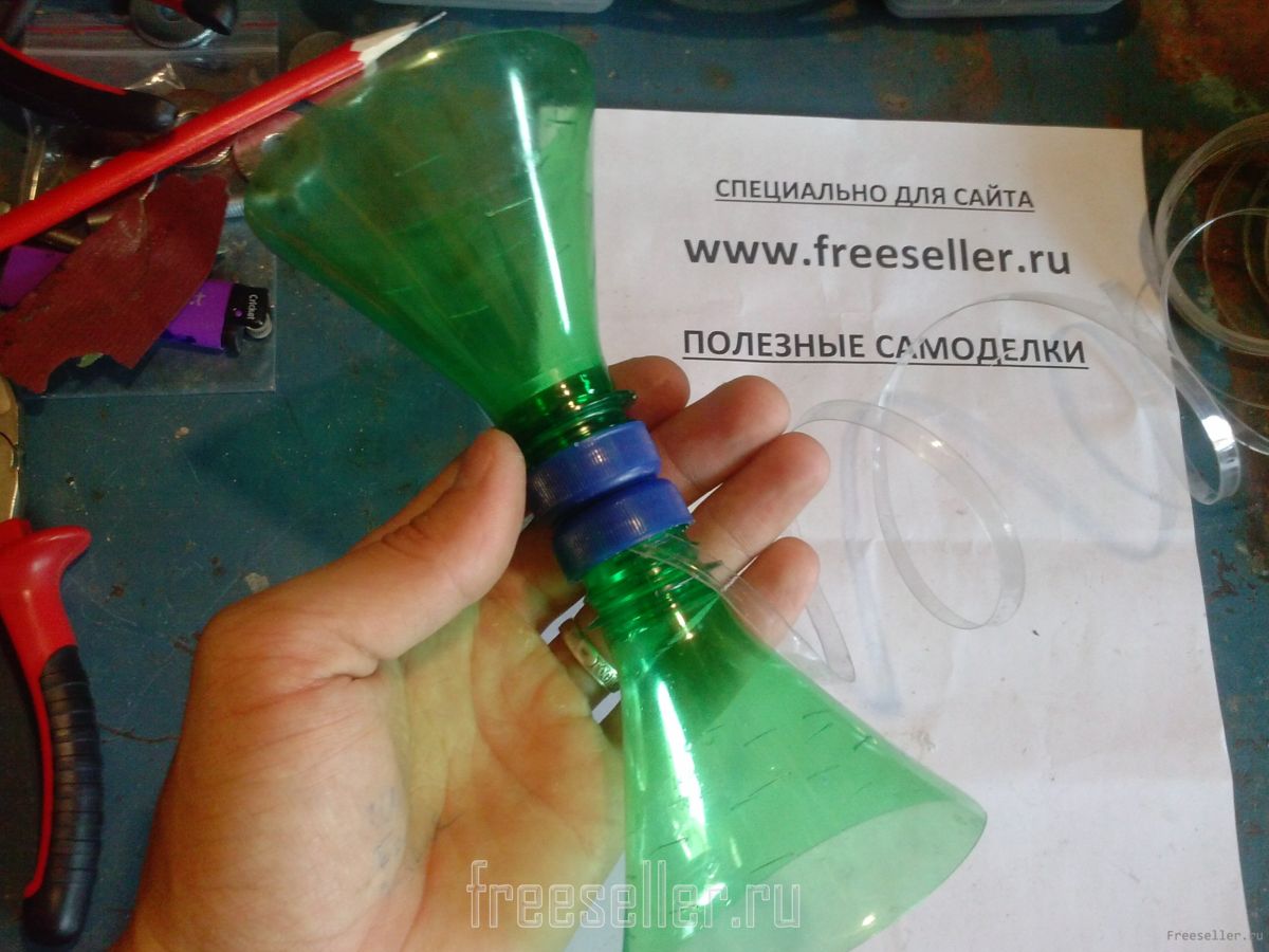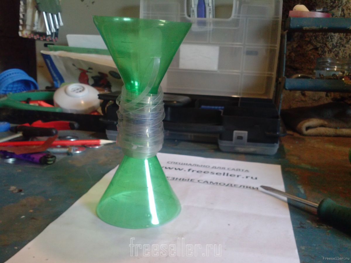 В моей предыдущей статье, я рассказывал, как изготовить ПРОСТОЙ СТАНОК ДЛЯ НАРЕЗКИ ЛЕНТЫ ИЗ ПЛАСТИКОВЫХ БУТЫЛОК. Теперь нарезанную ленту необходимо где-то хранить. Можно, конечно, смотать её в колечко, стянуть проволочкой и повесить на гвоздь….. но мы пойдем другим путем, тем более что катушку для намотки ленты, мы будем изготавливать из остатков пластиковых бутылок и поэтому будет безотходное производство!