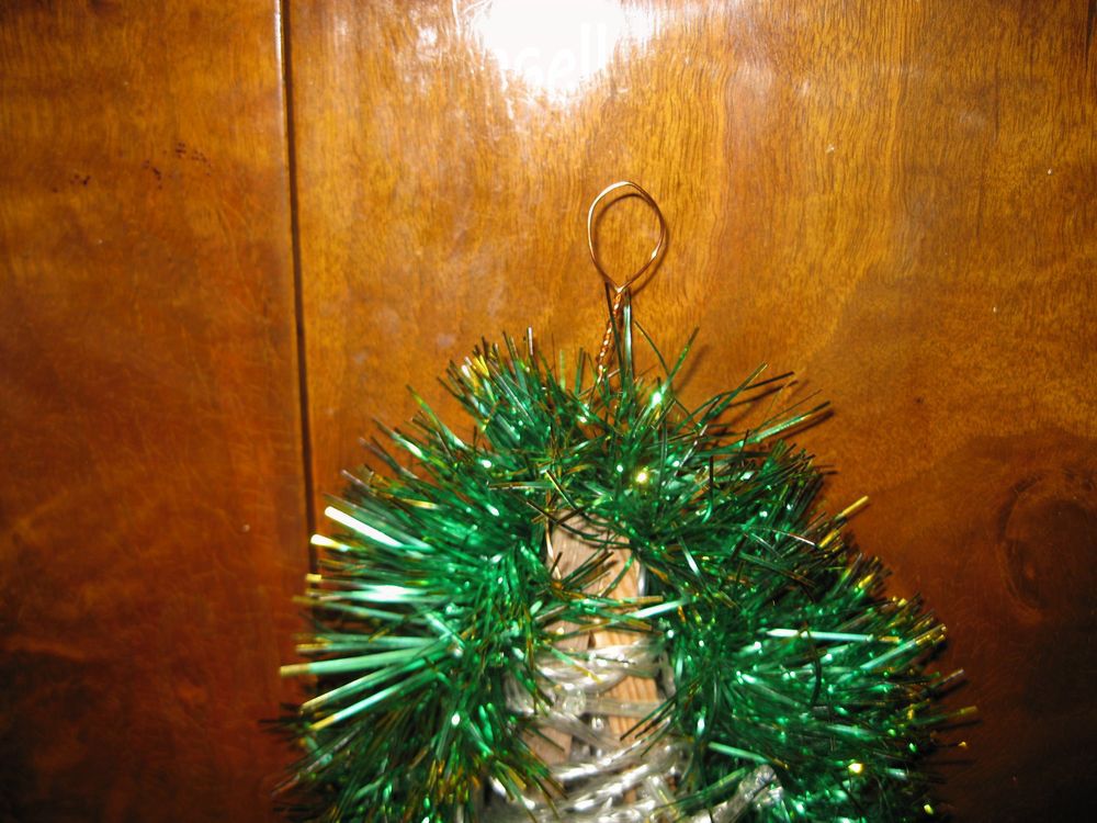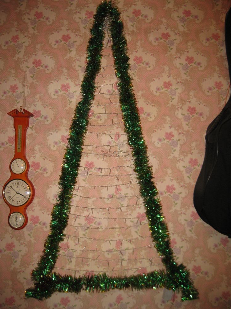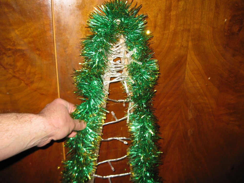 По контуру каркас украшается зеленой блестящей мишурой, что придает ему сходство с зеленой елкой.